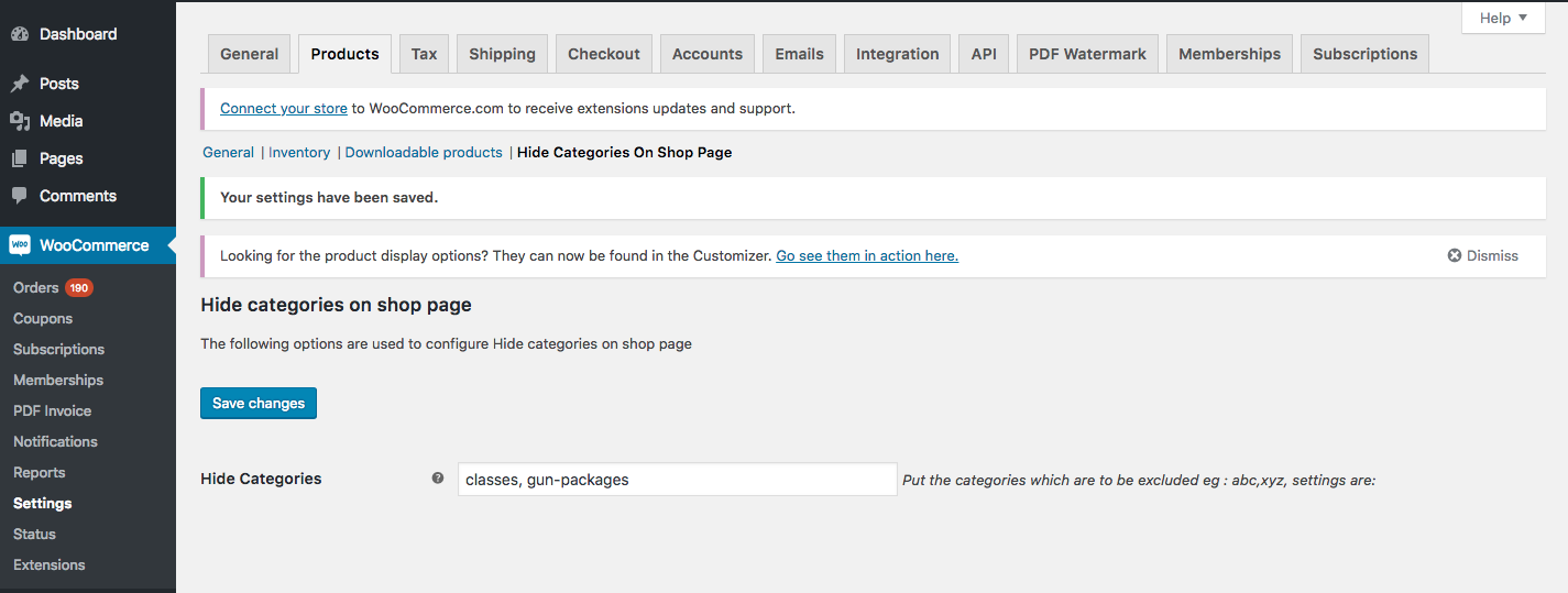 * Configure the plugin at Dashboard > WooCommerce > Settings > Products > Hide Categories On Shop Page